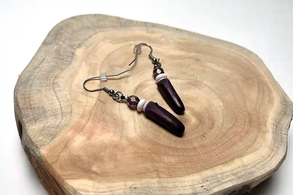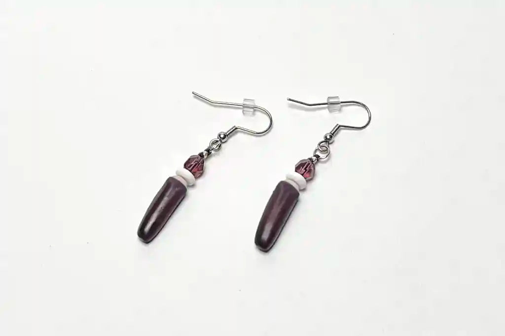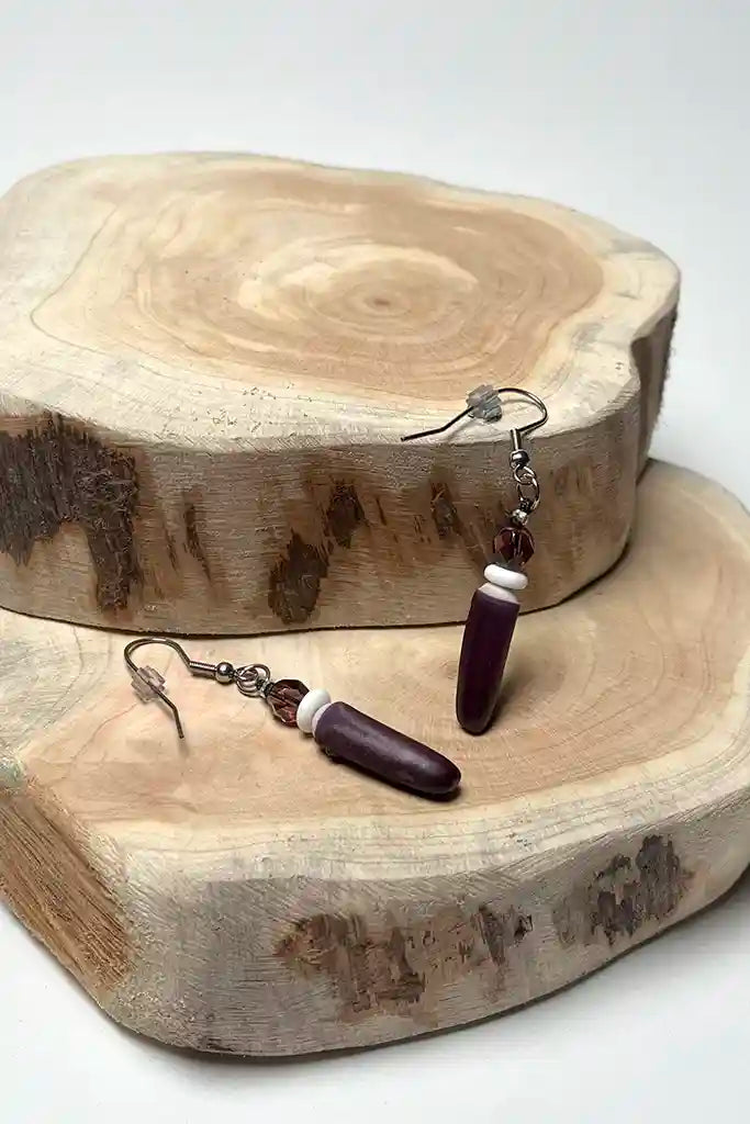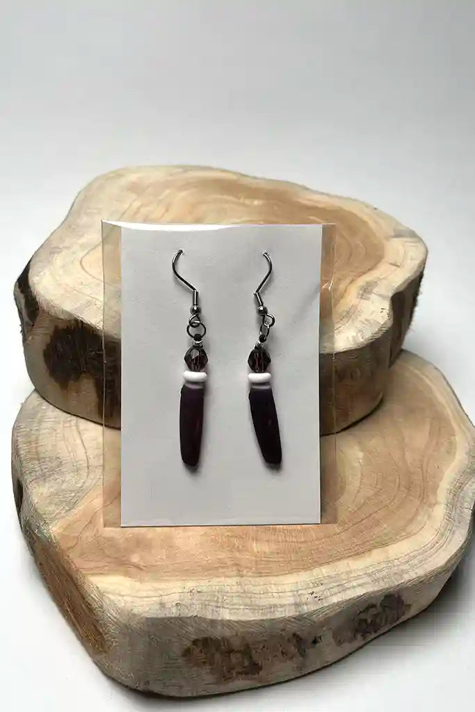 Purple sea urchin spine earrings with round faceted purple glass beads and hima discs. Hand crafted by CHamoru Master Carver-Body Ornamentation artist Jill Benavente. Attractive polished accessory great for both day and evening wear.